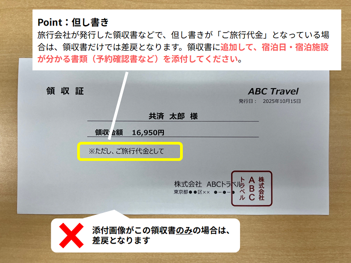 - ※領収書に宿泊日・宿泊施設名・宿泊施設の住所が記載されていない場合(例:旅行会社が発行した領収書で、但し書きが「旅行代金として」のみ記載されている場合など)、または、プラン名等から領収金額に室料が含まれているかどうかが判断できない場合には、旅行の詳細が記載された予約確認書などを、領収書と合わせて添付してください。