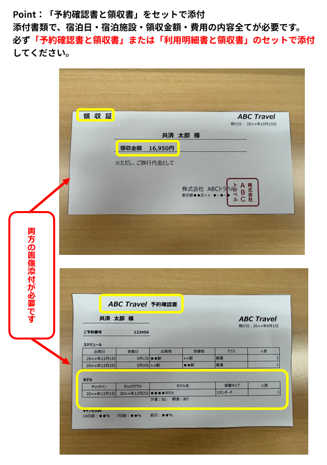 ※旅行会社が発行した領収書も、「予約確認書と領収書」または「利用明細書と領収書」のどちらかをセットを添付してください。