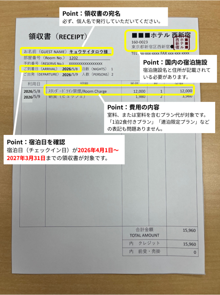 ただし、申請期限は宿泊日(チェックイン日)から3か月以内です。詳細は申請可能期間をご確認ください。