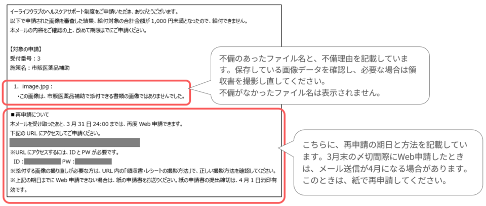 イーライフクラブでWeb申請の内容を審査した結果、給付できない場合に、登録されているメールアドレス宛にお送りするメールです。メールには、申請を差戻した理由と、再申請のご案内を記載しています。メールを受信したらすぐに内容を確認して、再申請してください。(なお、差戻したWeb申請データを編集して再申請する機能はありませんので、もう一度申請しなおしとなります。)