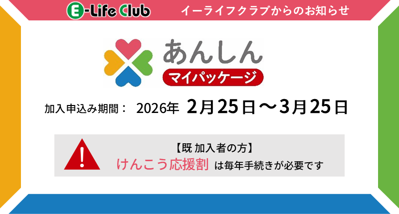 イーライフクラブが取扱う任意保険「あんしんマイパッケージ」の、申込み受付けのご案内です。