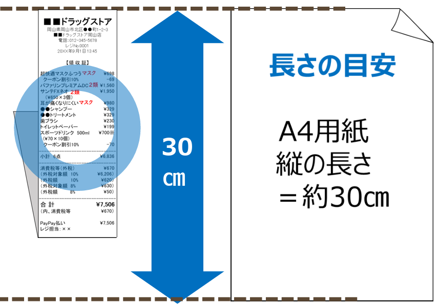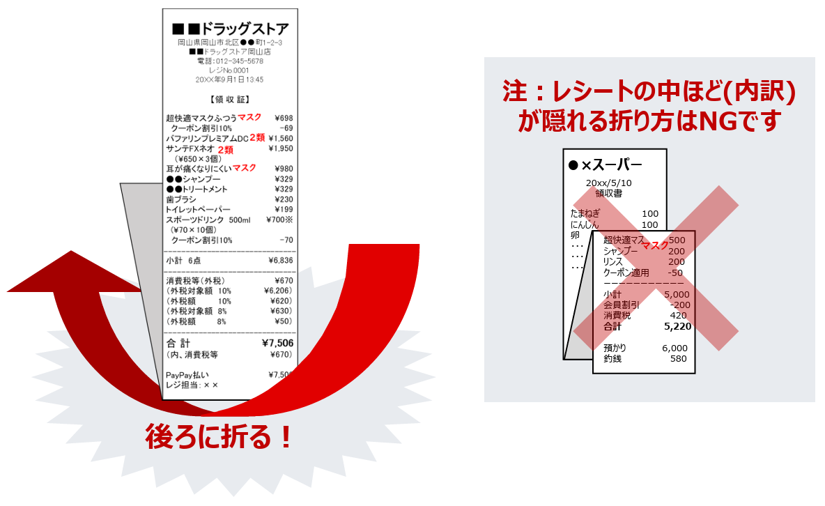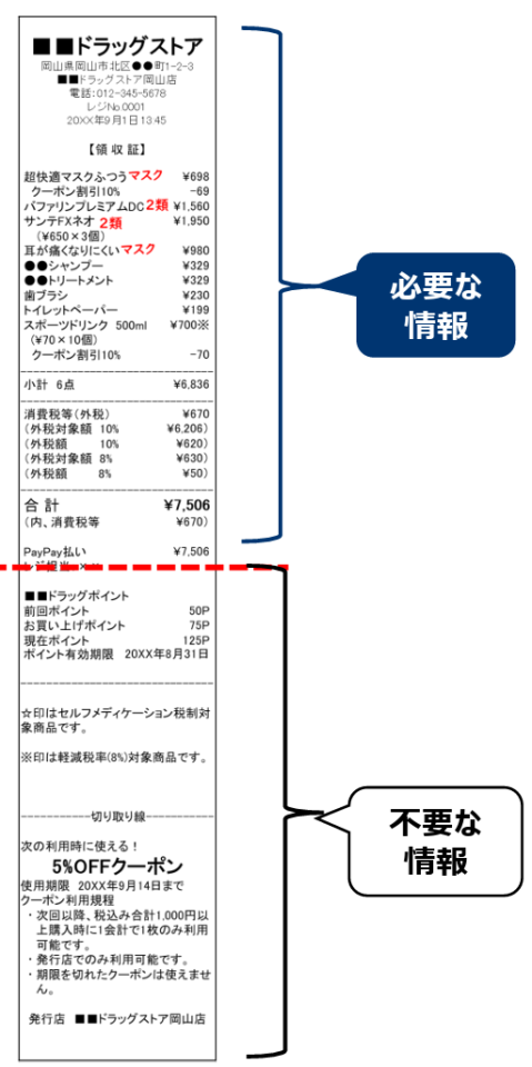 - ①レシートの中で、申請に「必要な情報」と「不要な情報」を確認してください。なお、必要な情報だけで長さ30㎝を超える場合は、紙申請をご利用ください。